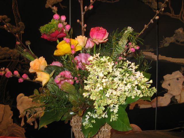 去年のクリスマスから、毎月近所のお花屋さんにアレンジをお願いしてます。 今月はお雛様も近いので桃の花を使って 豪華にしてくださぁ~い。 と一言お願いして出来上がったのがコレ。 ちょっとギューギューのアレンジに 見えてしまうのは私だけでしょうか... -